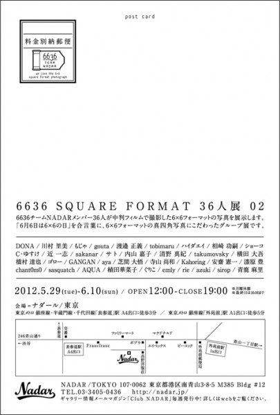 6636チームNADARメンバー36人が中判フィルムで撮影した6×6フォーマットの写真を展示します。